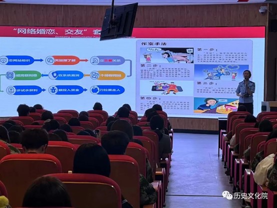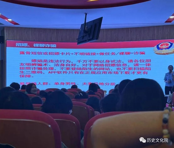 9月10日,市公安局反诈中心民警王琴在教学主楼201为学生们讲授“安全与法制教育”。