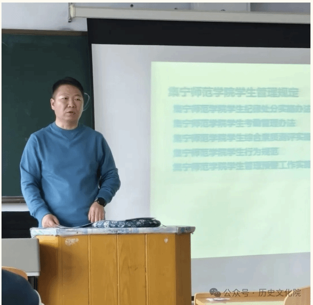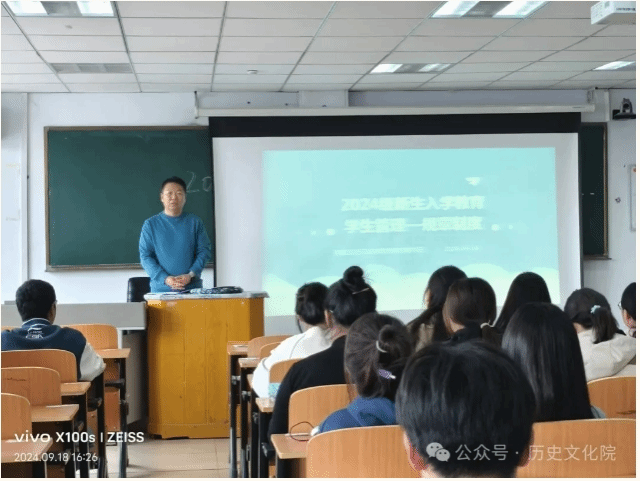 为帮助2024级新生尽快适应大学生活,了解学校的学生管理规章制度,历史文化学院党总支副书记宝音于9月18日下午,为2024级新生开展新生入学教育之学生管理规章制度专题讲座。