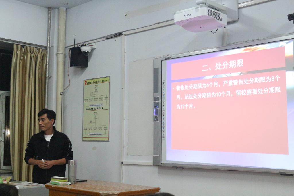 9月22日晚政史学院学工办主任田博于泉山校区主教学楼419教室为学生做校规校纪专题教育,认真解读了学生管理规章制度,对学生日常行为规范、纪律处分、贫困认定、考勤管理、公寓管理以及学校其他规章制度等进行了详细的介绍。