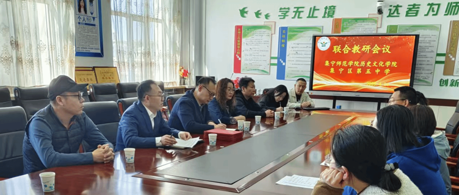 集宁区第五中学教学副校长池飞满,教导处主任王超峰,副主任林松桥,历史教研组组长陈佳文,历史组成员胡晔、皇甫利英、何沙沙、杨晶。我院党总支书记赛汉其其格、院长张军、副书记宝音、副院长章国军、教研室主任大晶、实习生代表梁子艳、赵佳琦参加了会议。