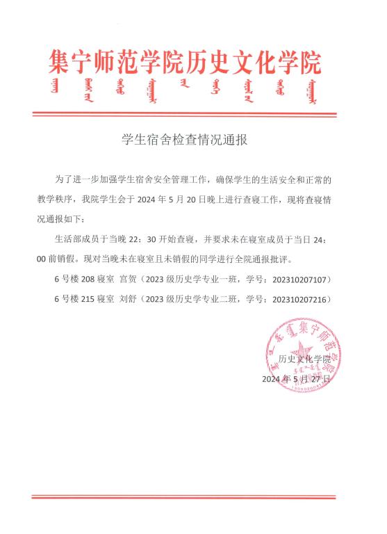 历史文化学院学生宿舍检查情况通报