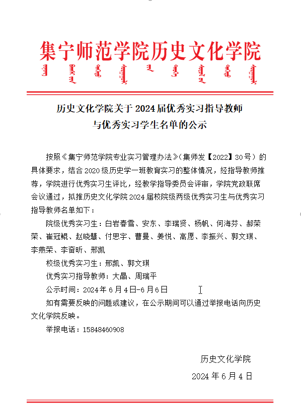 历史文化学院关于2024届优秀实习指导教师与优秀实习学生名单的公示