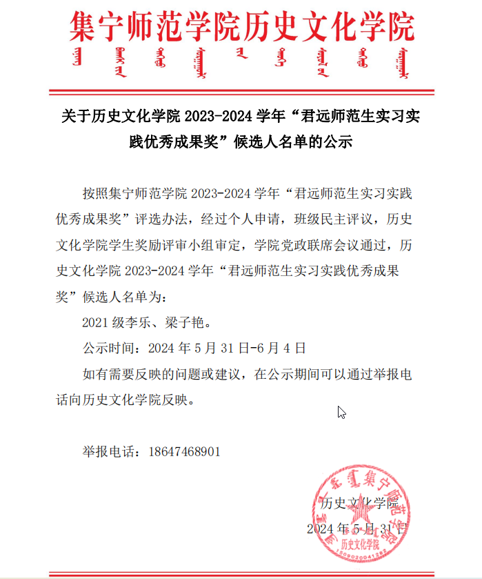 关于历史文化学院 2023-2024 学年“君远师范生实习实 践优秀成果奖”候选人名单的公示