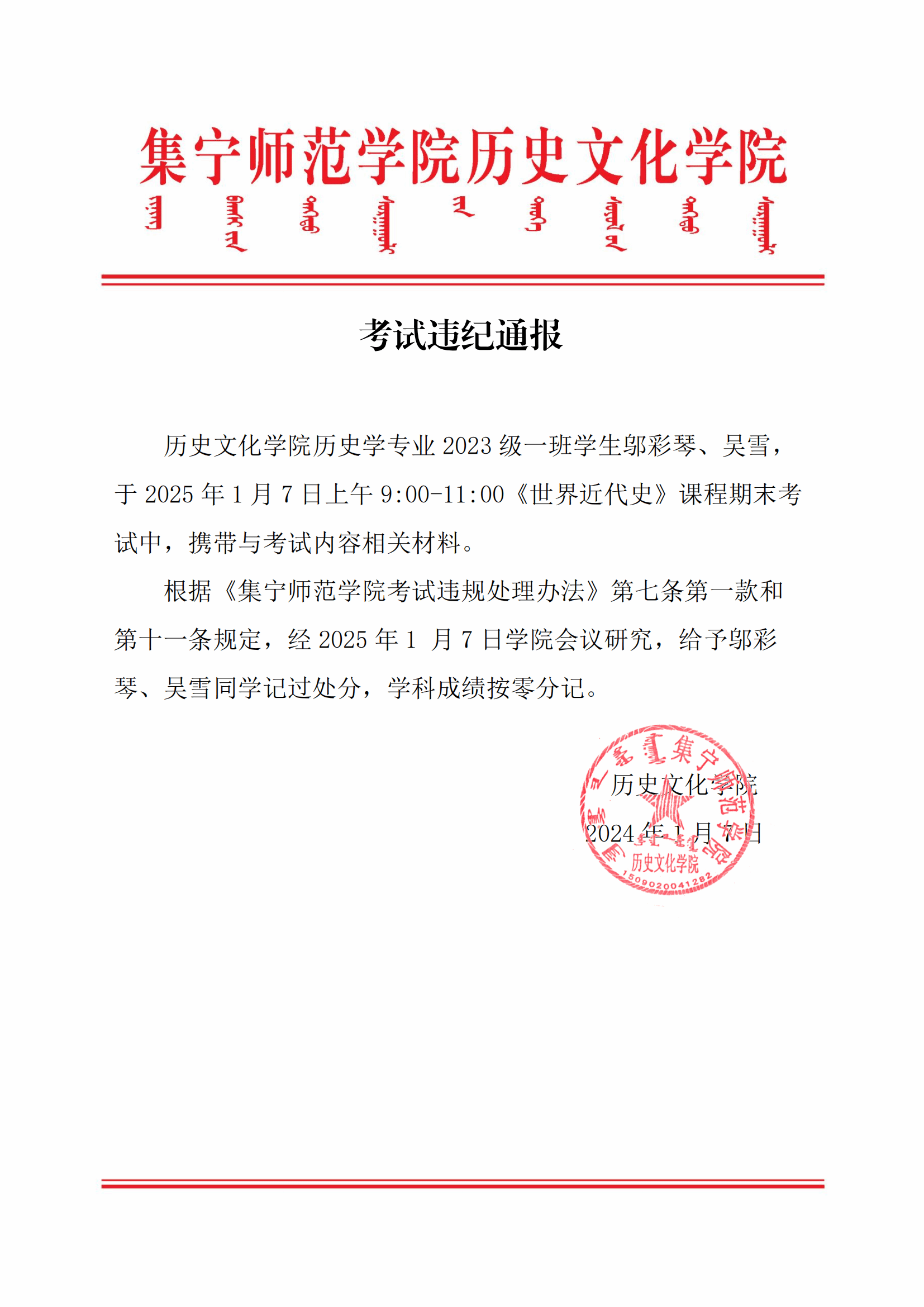 考试违纪通报