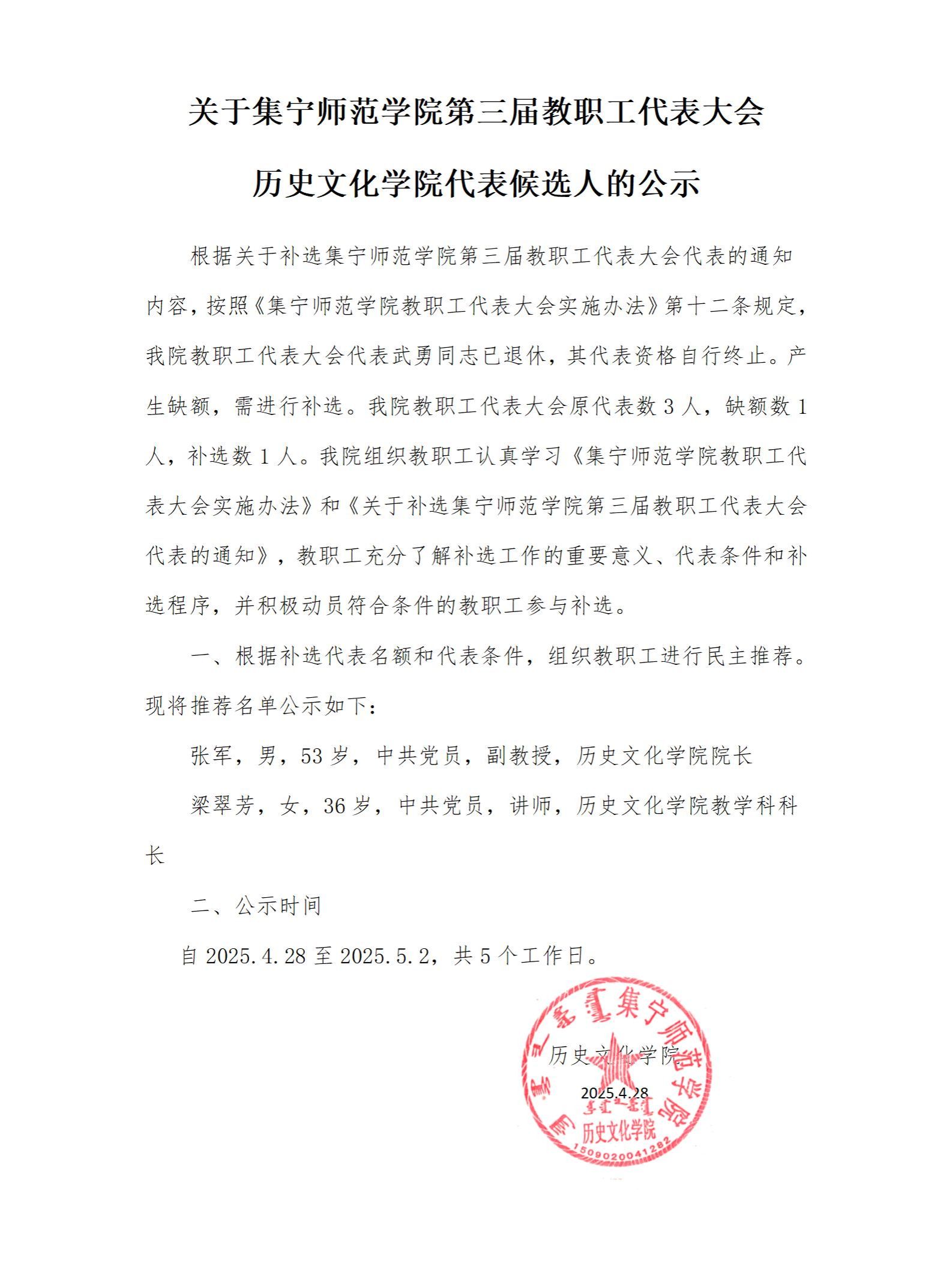 关于beat365正版唯一官方网站第三届教职工代表大会历史文化学院代表候选人的公示