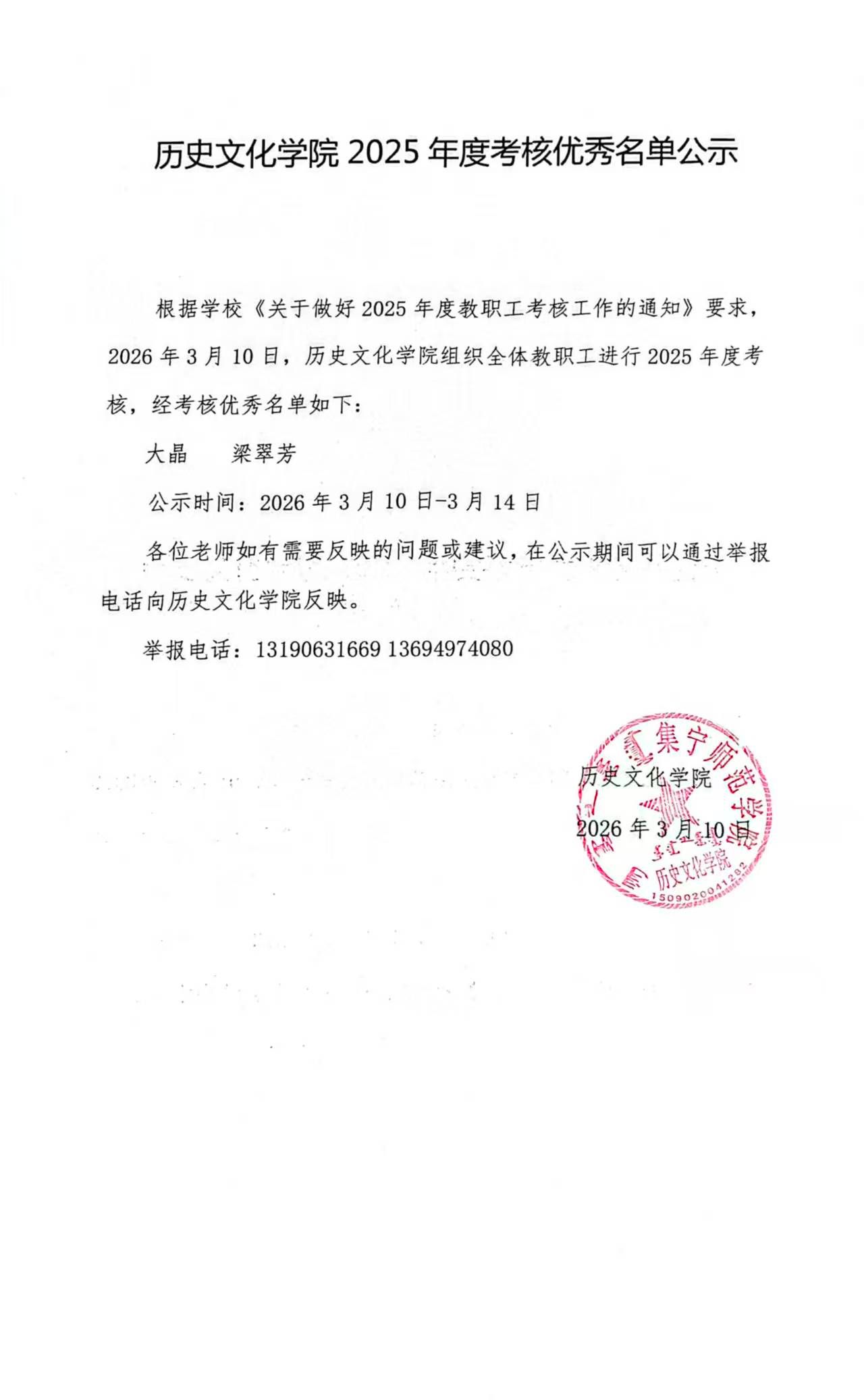 历史文化学院关于专业技术人员岗位聘期考核结果的公示