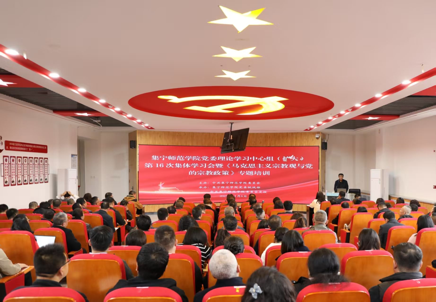 11月6日,beat365正版唯一官方网站召开党委理论学习中心组(扩大)2025年度第16次集体学习会暨《马克思主义宗教观与党的宗教政策》专题培训会。学校党委理论学习中心组成员,各级党组织书记、副书记、统战委员,各民主党派成员、无党派人士、党外知识分子代表等180人参加会议。会议邀请内蒙古大学党委委员、统战部部长、博士生导师斯琴高娃教授作专题讲座。党委副书记李景杰主持会议。