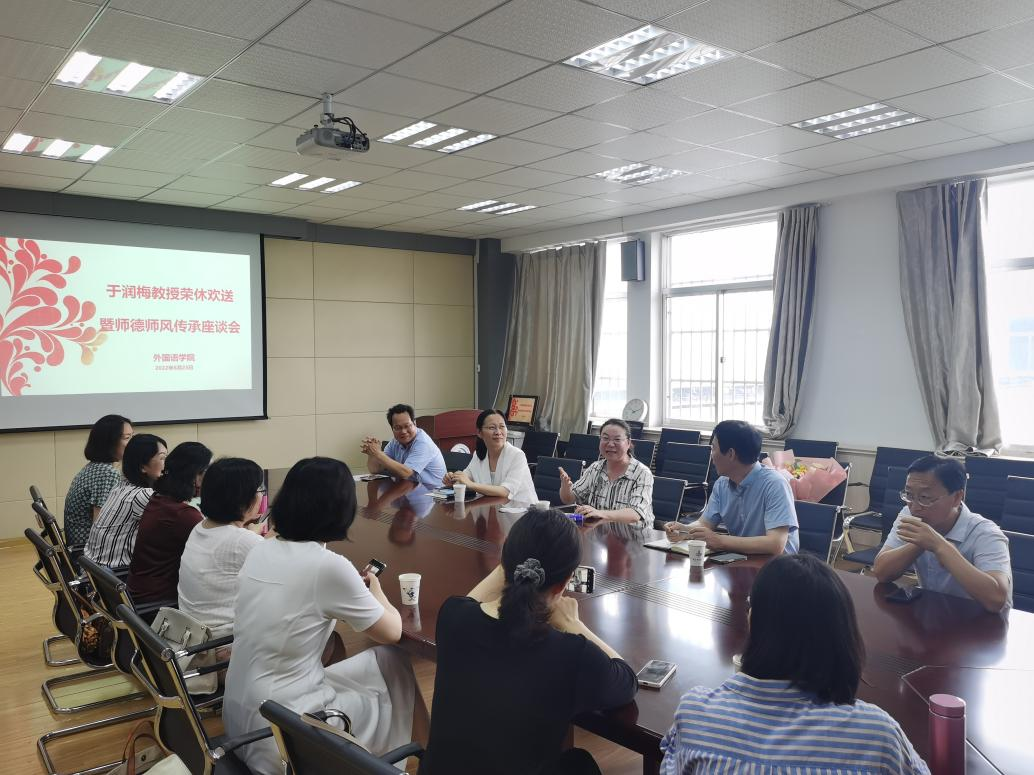 6月23日上午,开云kaiyun官方网站举办于润梅教授荣休欢送暨师德师风传承座谈会。退休教师于润梅教授、学院领导班子成员以及外语系教师参加,院长尹洪山主持。