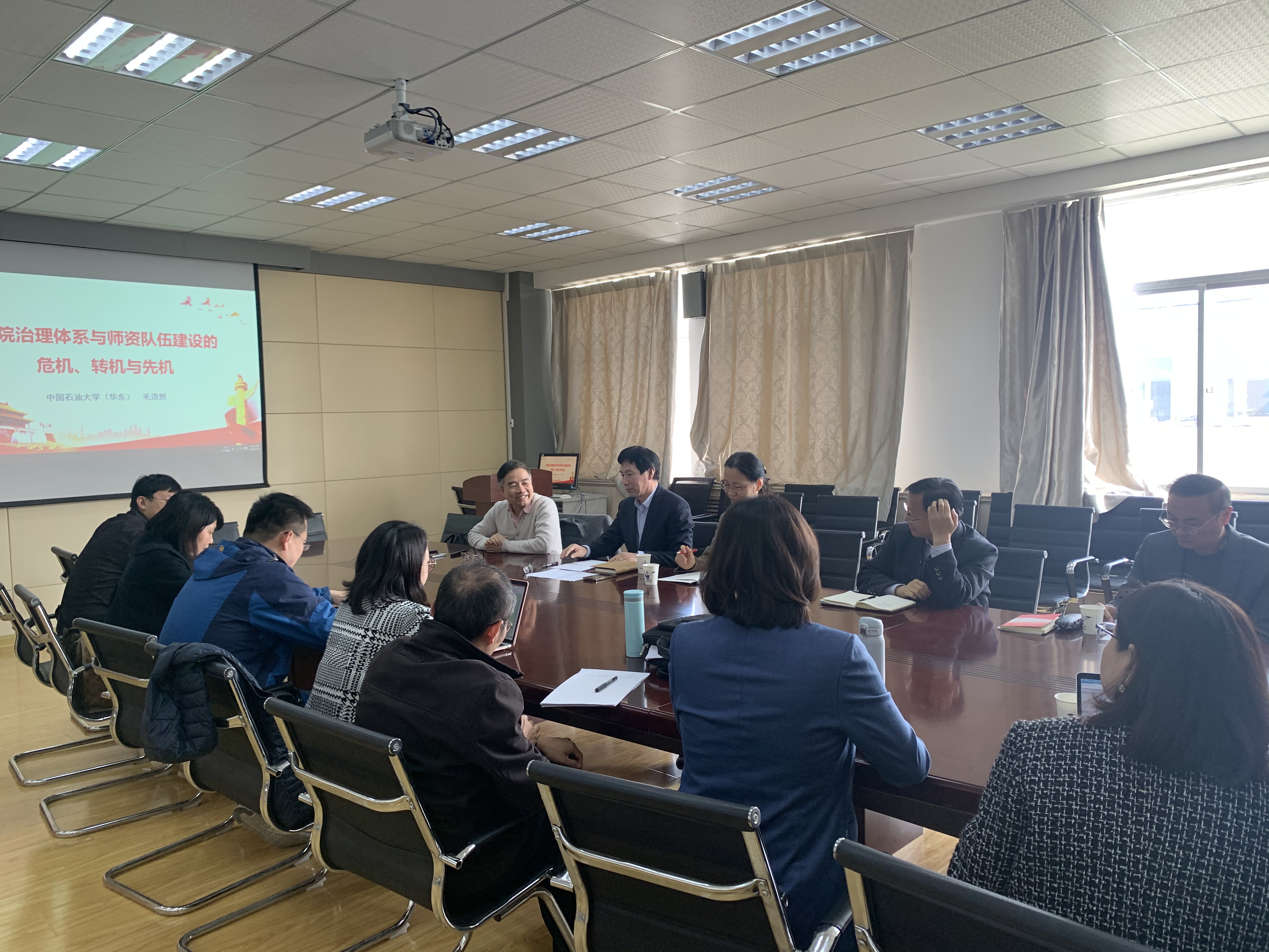 为深入开展学习贯彻习近平新时代中国特色社会主义思想主题教育,联系实际深化理论学习,4月25日,开云kaiyun官方网站党委邀请中国石油大学(华东)开云kaiyun官方网站院长毛浩然教授作《学院治理体系与师资队伍建设的危机、转机与先机》专题辅导报告。院长尹洪山主持,学院班子成员、学院管理骨干和部分学术骨干参加。