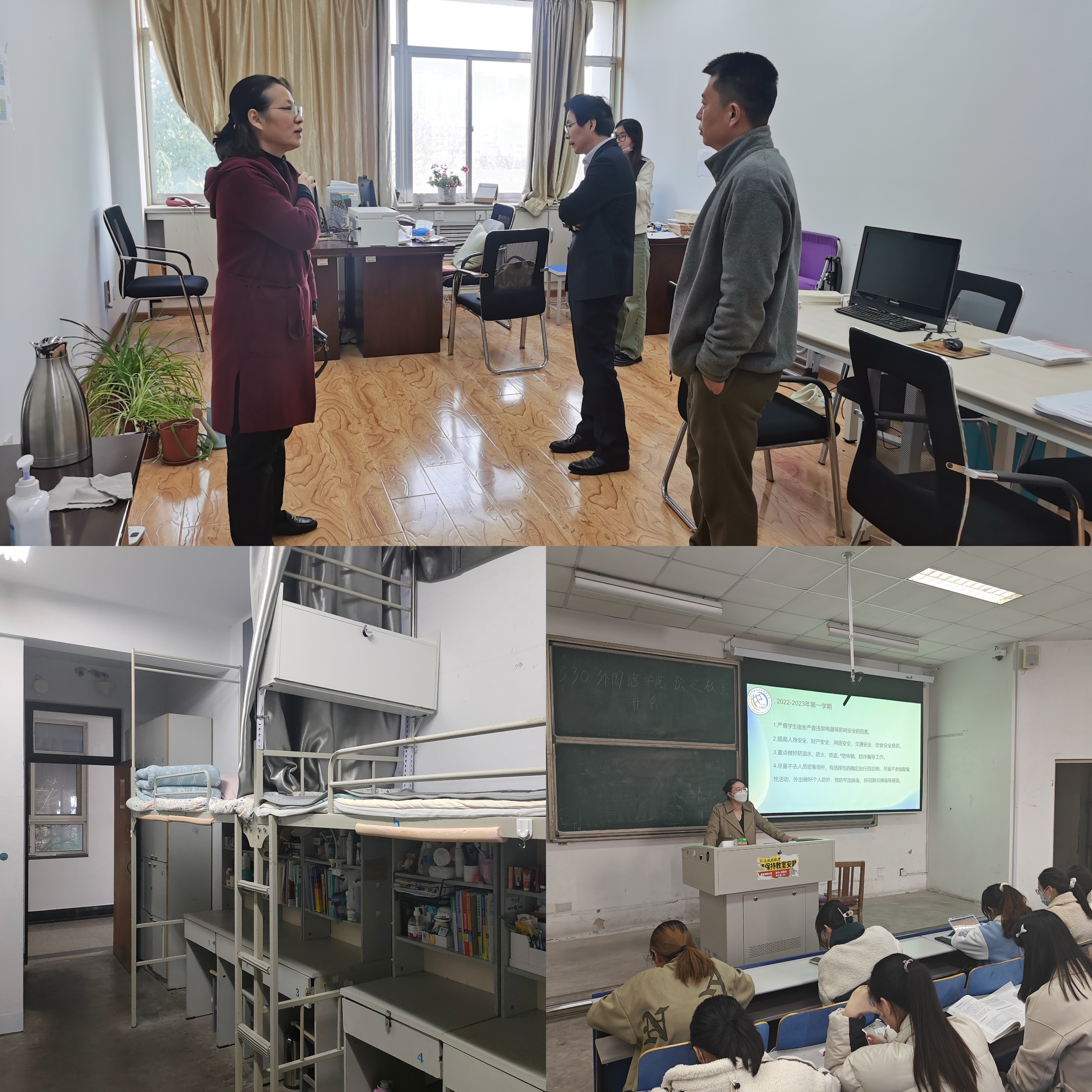 学生在宿舍内也按照要求进行了内务整理,学生会排查了宿舍水、电、暖等管线路的安全状况,特别是对违规使用大功率用电器、电源插排、违规充电等情况进行了重点排查。学院辅导员老师围绕校园防疫安全、宿舍安全、消防安全、财产安全和交通安全五个方面对同学们进行安全教育。同学们也对校园安全有了更深的认识,同时也为假期做好了安全准备。