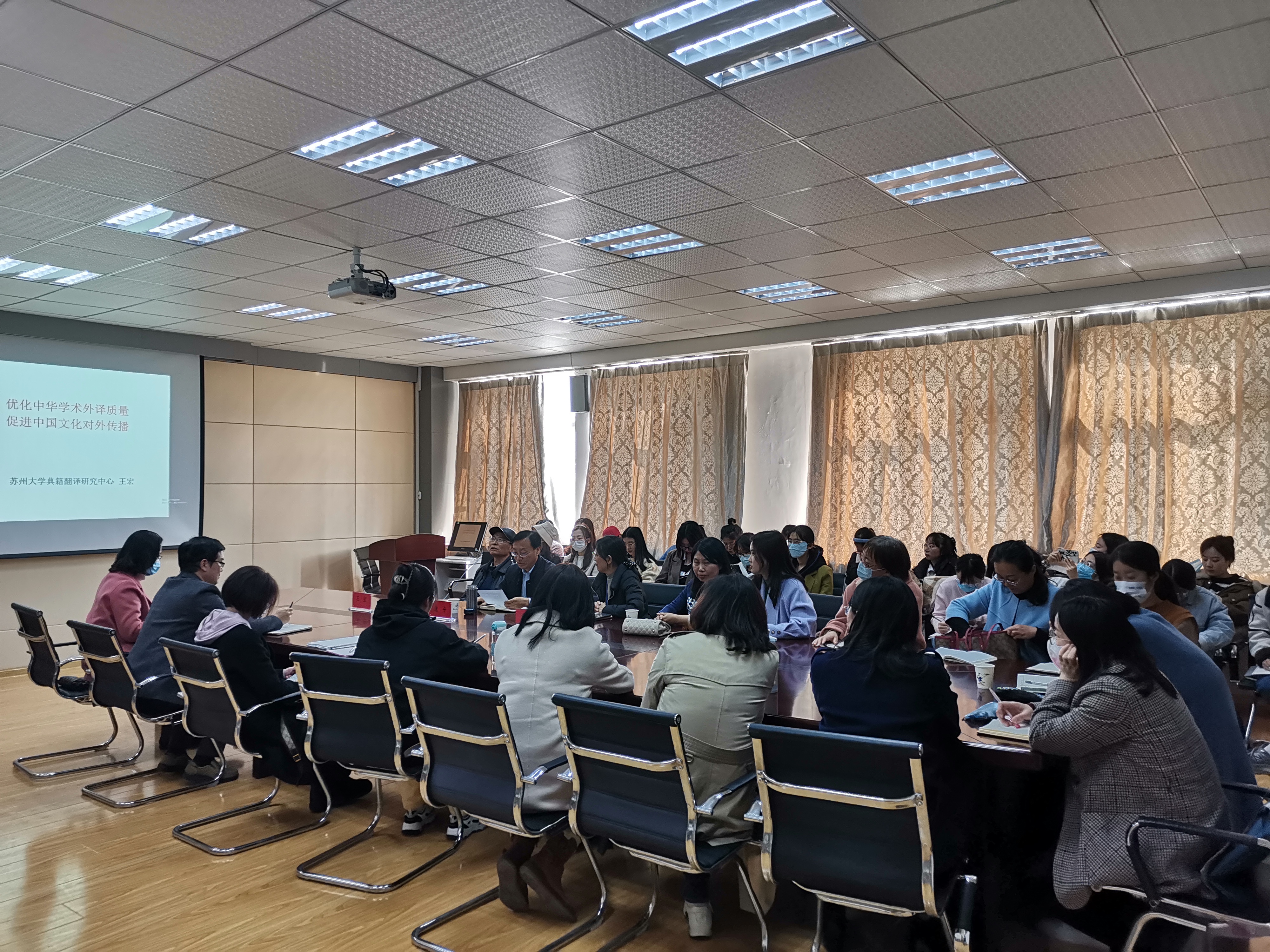 王宏教授的学术报告从中华学术外译界定及申报要求、译何为(学术外译的意义所在)、为谁译?(读者定位)、如何译?(翻译策略)以及译者主体性等方面展开。