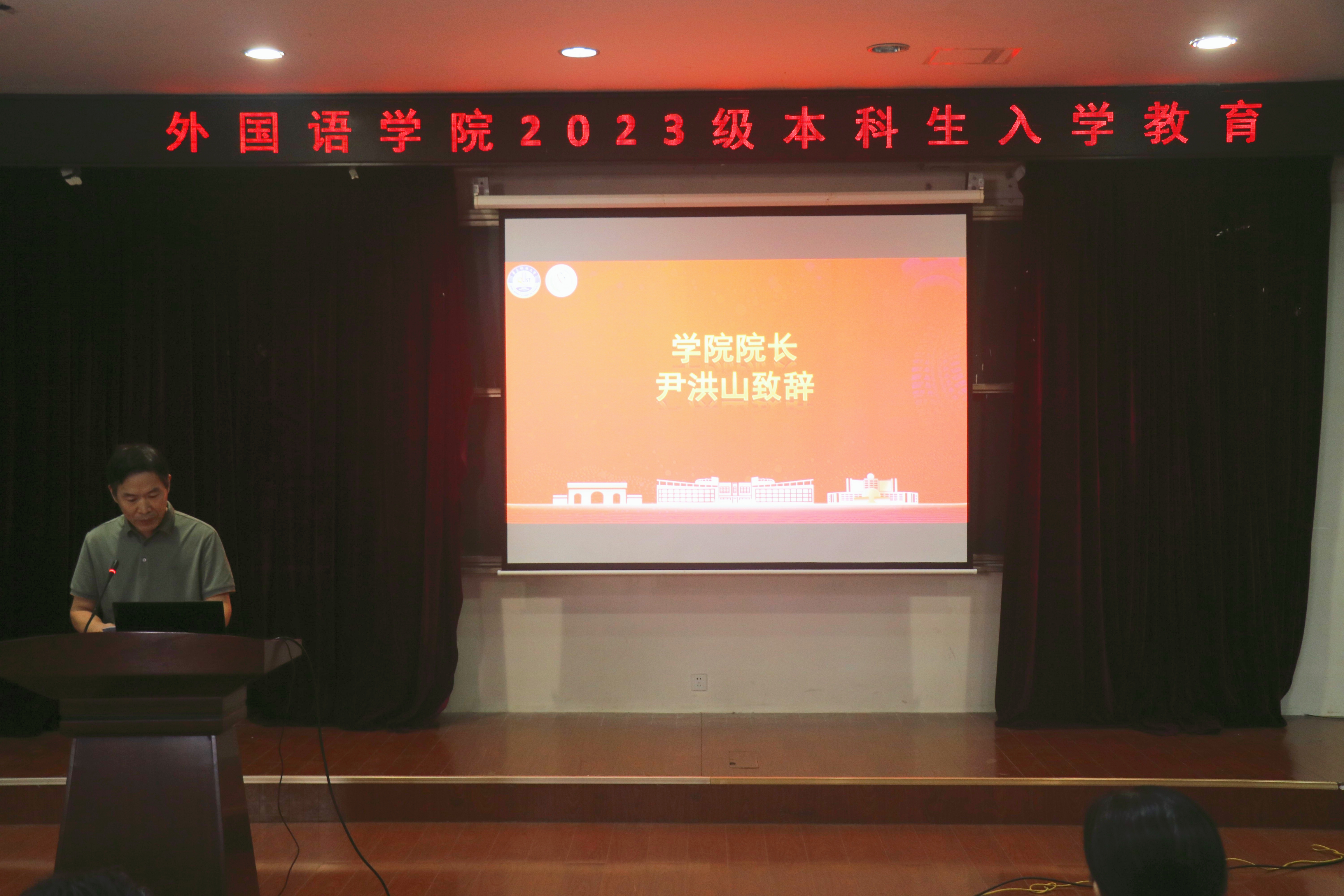 院长尹洪山在大会上致辞,介绍了学院的历史沿革、师资力量和科研成果,希望同学们具有浓厚的家国情怀、高尚的道德情操、树立远大的目标、养成良好的学习习惯,成长为具有国际视野的外语人才。