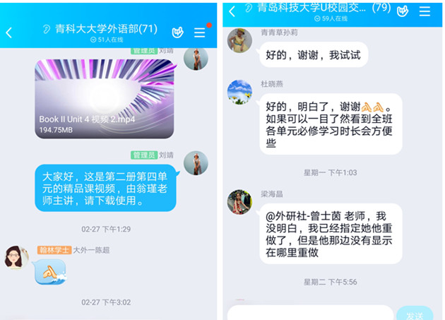 为方便教师解决使用平台中出现的问题,大学英语分别建立U校园和WE Learn随行课堂两个QQ群,设立专门管理员,邀请专业技术人员入群即时解答老师关于平台使用过程中的疑问。同时,安排骨干教师先行一步,研究平台使用,在教研室工作群积极引导帮助教师,不断提高教师现代教育技术素养。