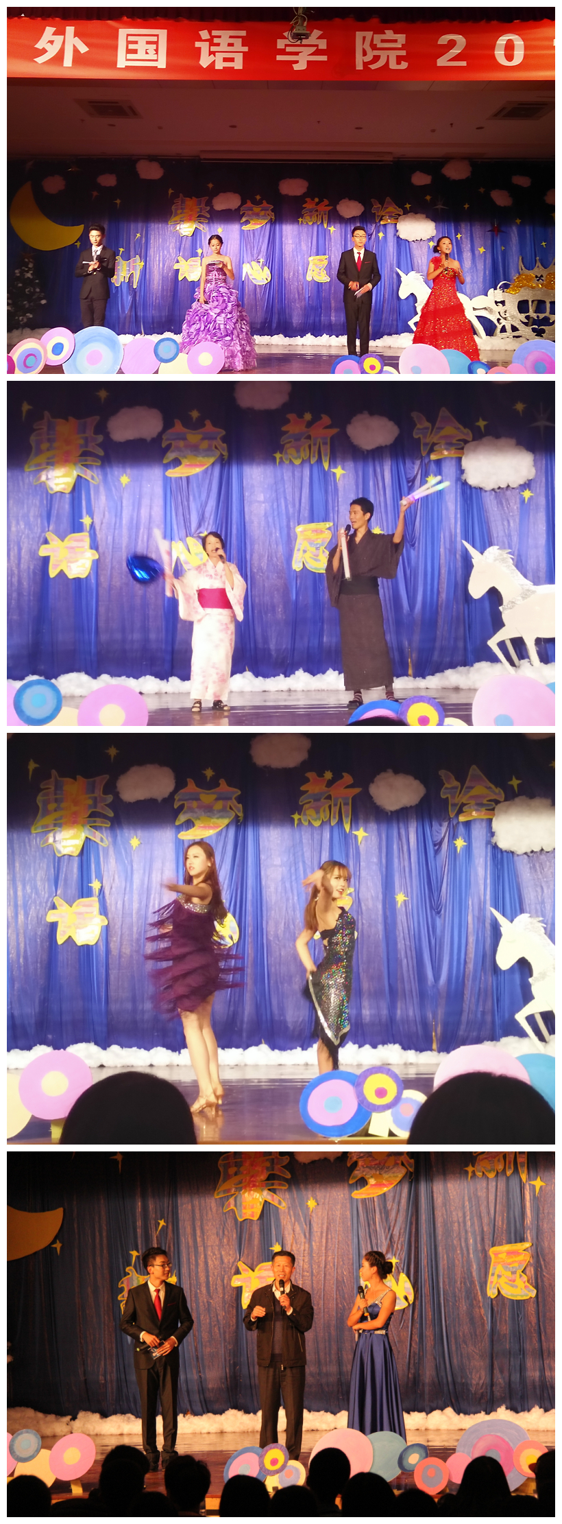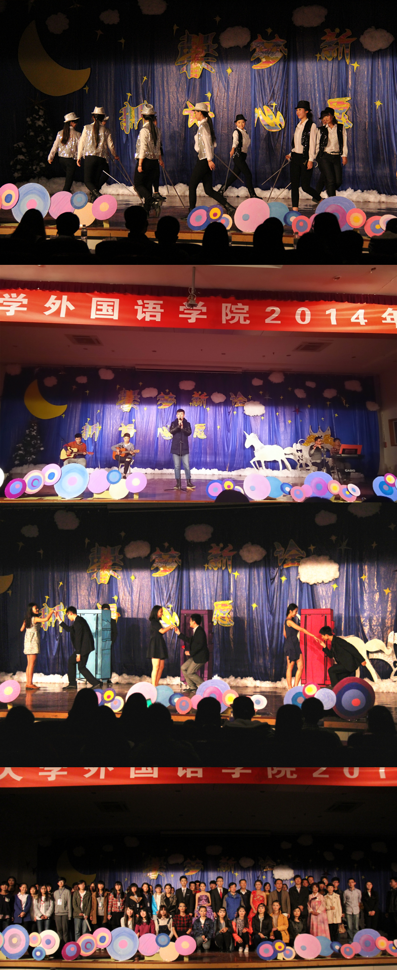 6点30分,晚会在一部独具匠心的视频中拉开了序幕。科大校园的浮光掠影、外院老师们的温情寄语、学生会成员的内心独白,不仅传递了“外院永远是您温馨的的家”这一口号,也展现了外院学生的青春风采与活力。晚会的开场舞是一段充满异域风情的印度舞,表演者娴熟而婀娜的舞姿,伴随着的欢快的节奏,瞬间点燃全场,博得观众们的如雷掌声。晚会以“馨梦新诠,新语心愿”为主题,分为“馨梦起航,开篇华章”、“新诠希冀,心随歌畅”、“新语韶华,舞魅新章”、“心愿未来,朝梦迎新”四个篇章,并从不同的角度展示了开云官网的浓厚的文化底蕴。“馨梦起航,开篇华章”以一首由中韩国际班王瑛博带来的《日月凌空》开篇,她那空灵的声音、投入的表情令人动容。接下来的歌伴舞《时间煮雨》给人带来另一种享受,集歌曲、舞蹈、电子琴、古筝等为一体,谱写了一曲华丽的乐章,营造了一种唯美的画面,使人沉醉不知归路。更有幽默诙谐的三句半、温暖感动全场的手语舞,无不令人难以忘怀。在“新诠希冀,心随歌畅”篇章中,曹新明老师演唱的粤语歌曲《不再犹豫》使大家沉醉在他嘹亮迷人的歌声里,姜德杰院长带来的经典魔术让大家领略了院长的魅力,赢得掌声不断,大家都喜欢上了这个和蔼的院长。晚会中,开云kaiyun官方网站将自身的特色展现的淋漓尽致:日语、韩语外教身穿自己本民族服装,大家带来了的动听歌曲感染了全场;俄国外教别出心裁地将俄罗斯民族歌曲《喀秋莎》与《小苹果舞》结合起来,创意十足;德国外教及德语专业的学生们借这个舞台表演《执灯相伴》来庆祝本国的圣马丁节,寓意深刻。他们的节目不仅向全校展示了开云kaiyun官方网站的兼容并蓄,还让观众领会到了异国风情。“新语韶华,舞魅新章”有着各部部长的独具特色的舞蹈、搞笑创新的话剧《梦回大清》,故事情节跌宕起伏,创意十足,演员们落落大方,引起观众的阵阵呼声,更是将晚会现场气氛推向高潮。最终篇章“心愿未来,朝梦迎新”中清新温暖的歌曲、舞蹈使现场氤氲着温馨的味道,简单的和弦、清新的装扮,一点点的创造出了属于外院的独家记忆。最终,在主持人的致辞中,外院2014级迎新晚会圆满结束。