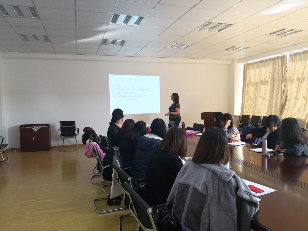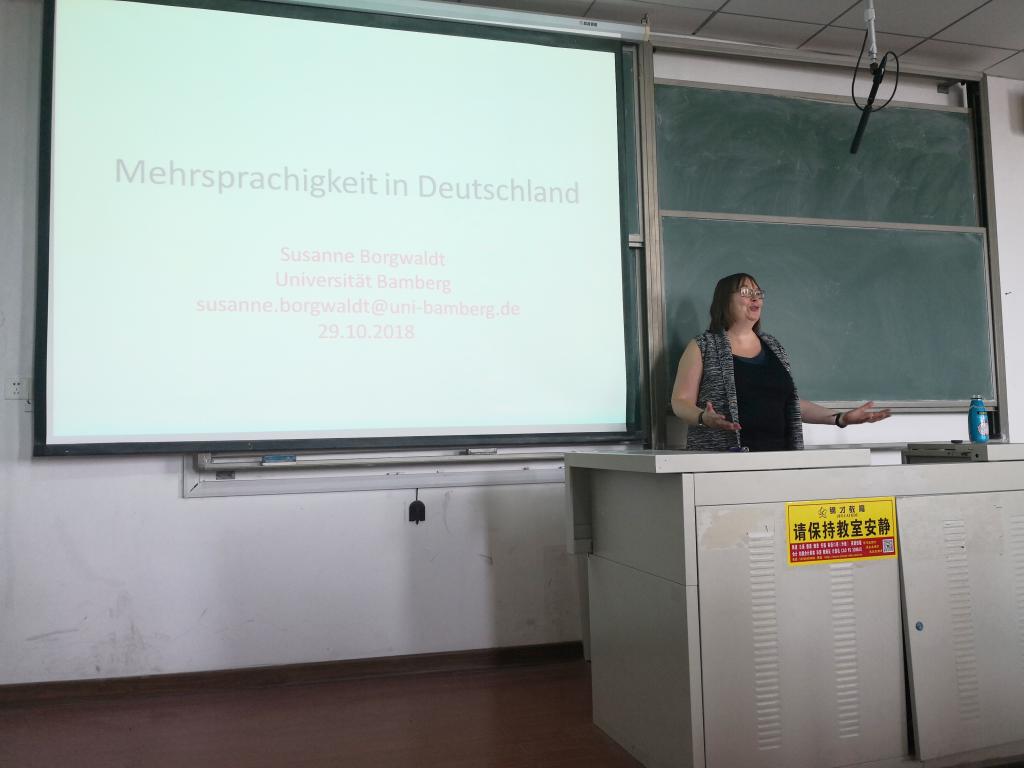 10月27日至11月3日,德国班贝格大学Susanne Borgwaldt教授应邀在开云官网进行了为期一周的访学,期间共举办了三场学术报告,主题分别为《德国的多语化(Mehrsprachigkeit in Deutschland)》、《德语构词法之复合词(Wortbildung-Komposition)》和《二语习得研究心得(L2-Erwerb)》,并围绕《多语化和第三语教学(Mehrsprachigkeits- und Tertiärsprachendidaktik)》这一主题开展了为期三天的教师培训,开云kaiyun官方网站德语系全体教师及部分中德科技学院、中德双元工程学院的德语教师参加了此次培训。经过一周的学习与交流,师生们都感到受益颇丰。