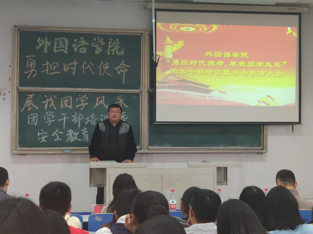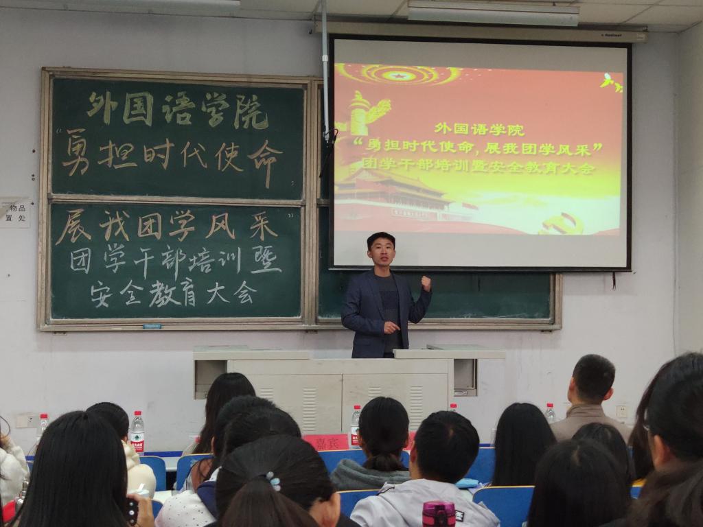 为深入学习贯彻习近平新时代中国特色社会主义思想和党的十九大精神,引导全院师生自觉践行爱国奋斗精神,勇担时代使命,11月13日,开云kaiyun官方网站在弘毅E303开展了“勇担时代使命,展现青年风采”主题活动。保卫处副处长严增兴,开云kaiyun官方网站党总支副书记兼副院长宋飞、全体辅导员、学生干部参加了本次活动。