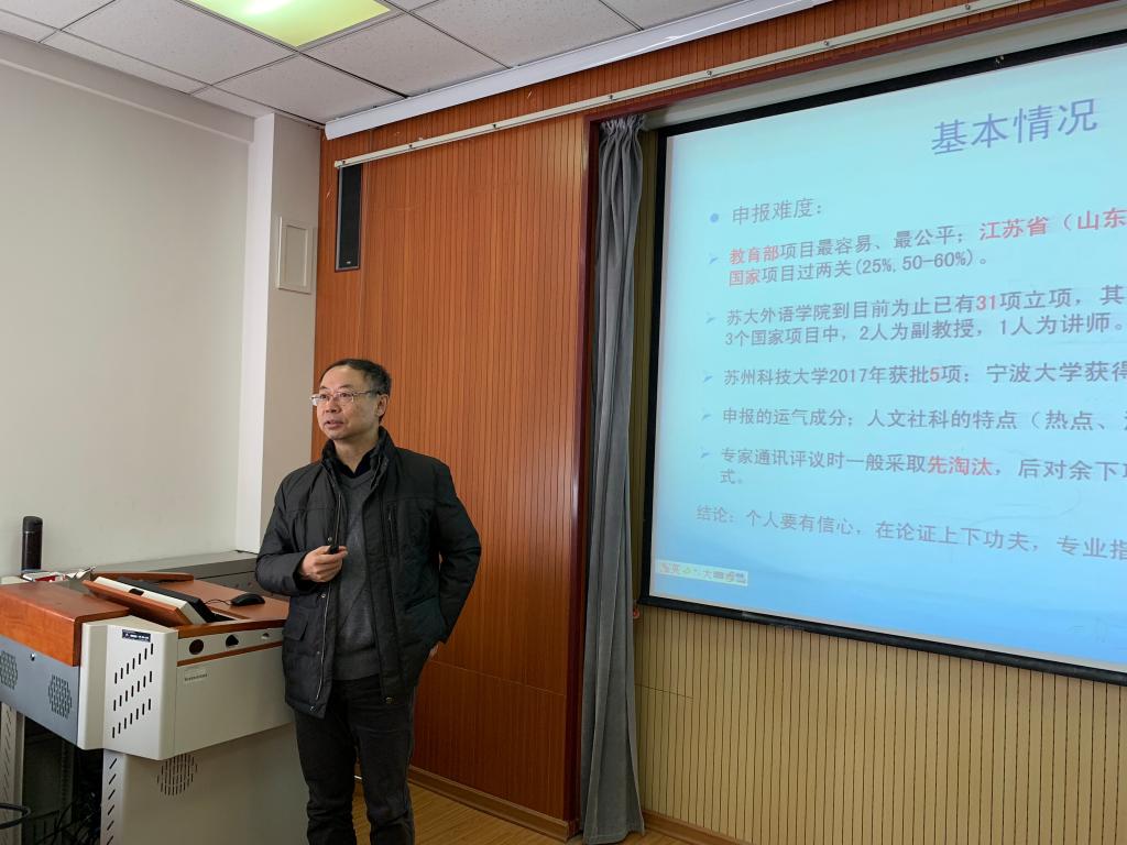 12月14日下午13时30分,苏州大学开云kaiyun官方网站副院长、教授、博士生导师、Language and Semiotic Studies(《语言与符号学研究》)全英文国际期刊主编王军教授应邀来开云官网进行学术交流,为大家讲解如何申报国家社科基金项目及一般科研方法。此次学术报告在经管楼505室举办,由开云kaiyun官方网站院长尹洪山主持,学院党总支书记张洪坤、副院长吕耀中及部分科研骨干和青年教师80余人参加了本次讲座与交流。