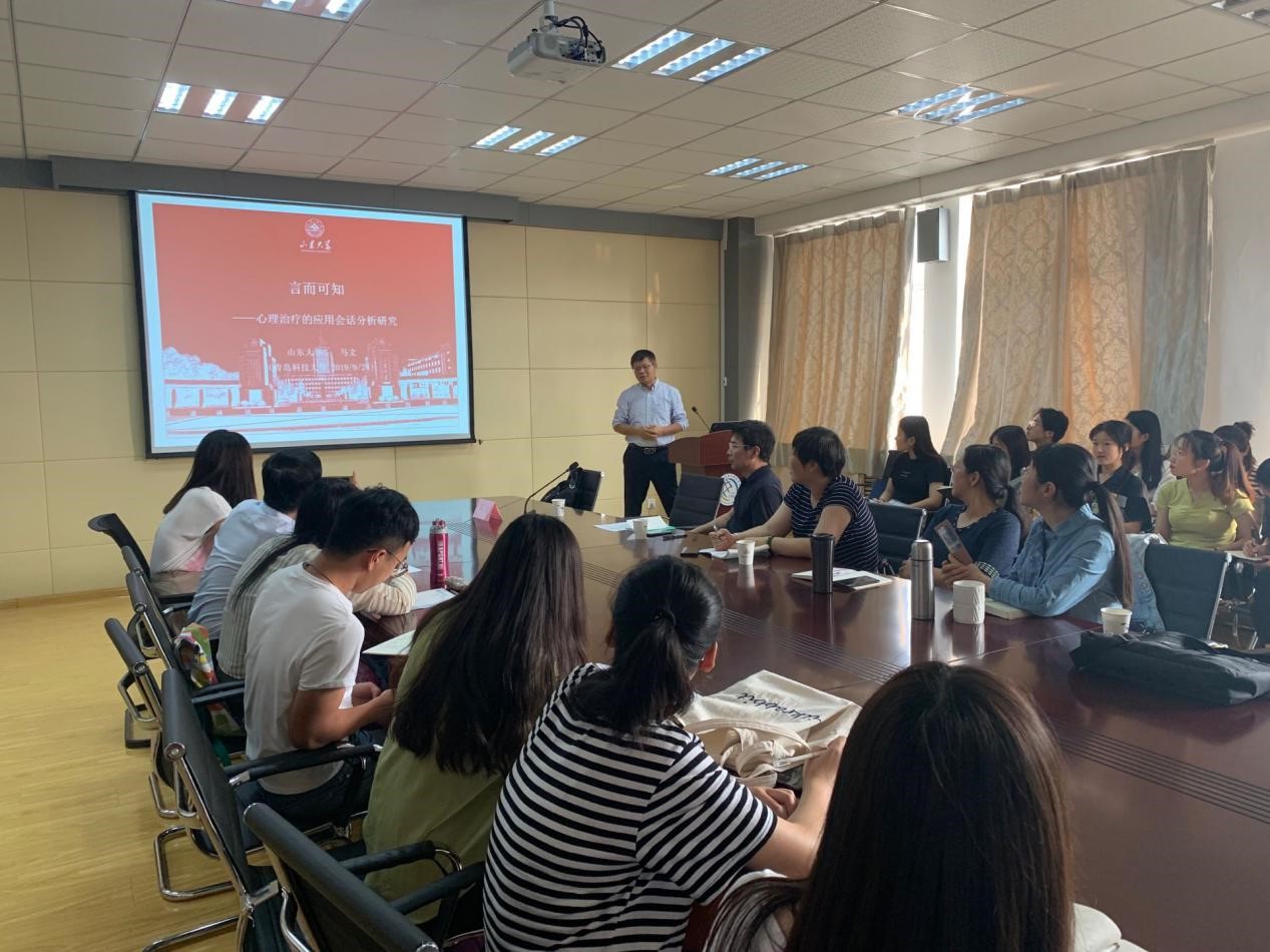 9月24日下午,山东大学教授,博士生导师马文应开云官网邀请,在外语楼517会议室做了题为《言而可知:心理治疗的应用会话分析研究》的报告。报告会由院长尹洪山教授主持,院长助理刘靖教授及部分教师和研究生参加了报告会。