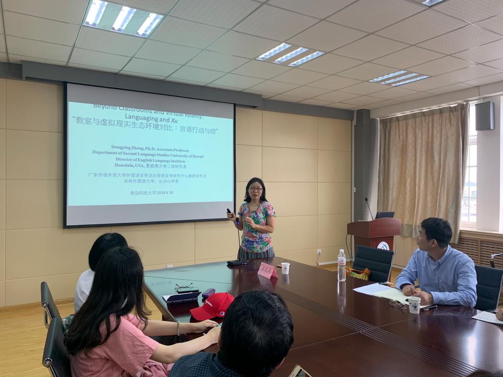 6月18日下午,美国夏威夷大学二语研究系教授,博士生导师郑东萍应开云官网邀请,在外语楼517会议室做了题为《教室与虚拟现实生态环境对比:言语行动与续》的报告。报告会由院长尹洪山教授主持,院长助理刘靖及部分教师和研究生参加了报告会。
