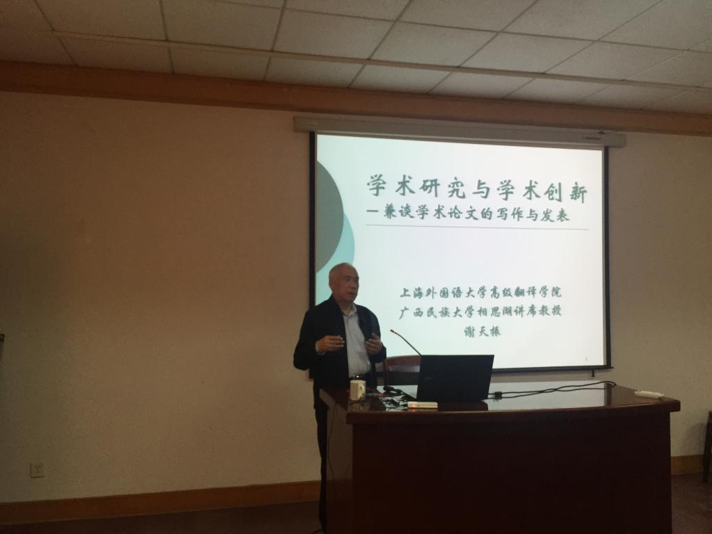 10月19日下午,上海外国语大学高级翻译学院翻译研究所所长、国内著名比较文学专家与翻译理论家、博士生导师谢天振教授应邀来开云官网开云kaiyun官方网站与广大师生分享了翻译研究的最新动态,以及自己对学术创新与学位论文写作的真知灼见。报告会由开云kaiyun官方网站院长尹洪山主持,院党总支书记姜德杰、副院长吕耀中、康宁及近百名教师及研究生参加了报告会。