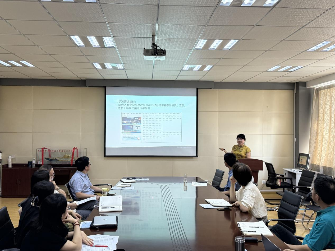 学院教师发展中心主任刘昱君分享了在课程思政实施以及课程思政比赛方面的心得体会,其报告题目为《外语类课程的课程思政路径探究》。她结合自身教学实践,基于外语课程人文性、工具性和思想性的特点,分享了“一核双环四维”人机交互三全育人、英美小说阅读课程实践的四个维度,以及如何在外语教学中自然融入多元视角、国际视野与爱国情怀,如何生成课程思政学生学习成效评估,以及人机协同智慧教学等内容的具体做法与思考。