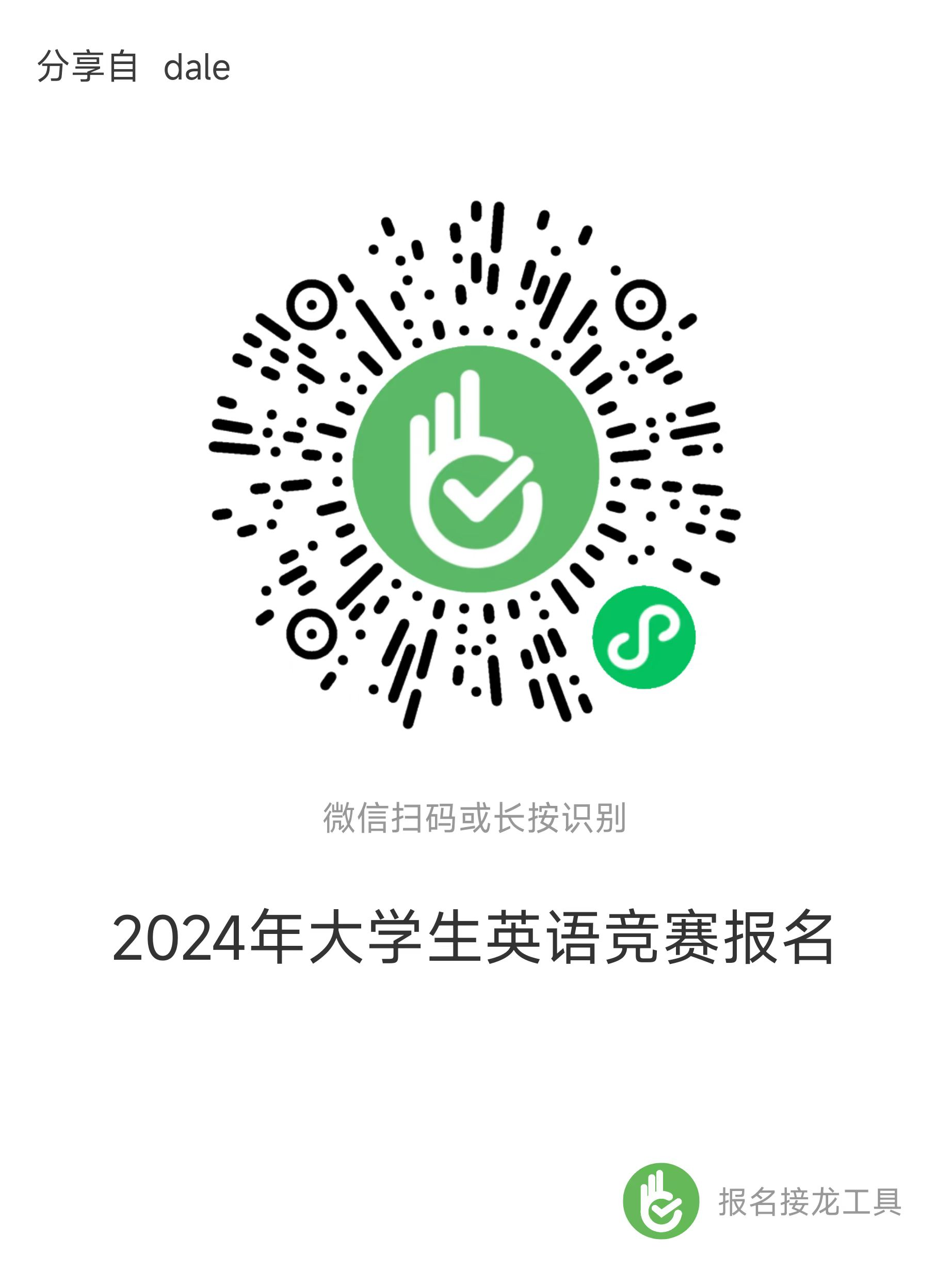 1. 报名:从2024年3月1日-2021年3月18日,通过报名接龙(微信“接龙工具”小程序,链接:https://rl.uil.ink/?r=ZTSBCYHpS或者识别下方报名图片)填写参赛学生名单、竞赛类别等信息,每人仅限填报一次,信息务必准确,报名后务必按照校区实名(班级姓名)加入对应的QQ群,群内会发布最新通知信息。报名逾期不候。根据《2024年全国大学生英语竞赛(NECCS)通知》规定,本次竞赛全部收费为50元/人。