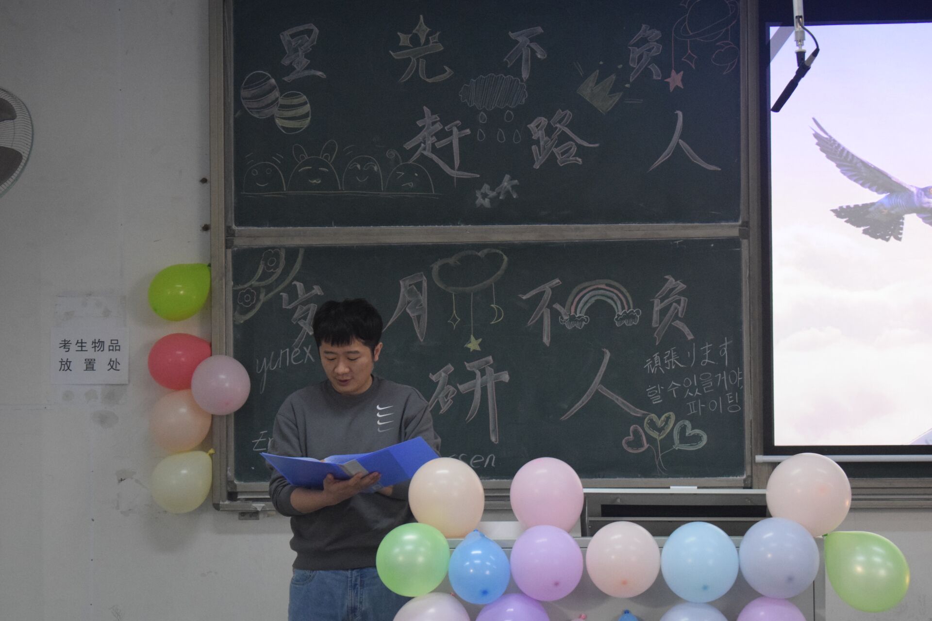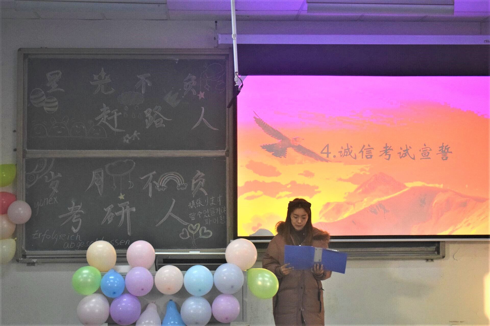 “向前跑,就算鲜血洒满了怀抱。”《追梦赤子心》的旋律响起,考研路漫漫,但有梦想为伴,相信考研学子们定会披荆斩棘,砥砺前行。疫情防控,“形势依然严峻,千万不能掉以轻心”,李东阳老师为各位考研学子进行了假期疫情防控安全教育,“报备体温、戴好口罩……”,简单的叮嘱话语中,蕴含着老师对学生的无限关怀。王玉婕同学代表全体考生郑重宣誓:承诺诚信应考,杜绝作弊行为。