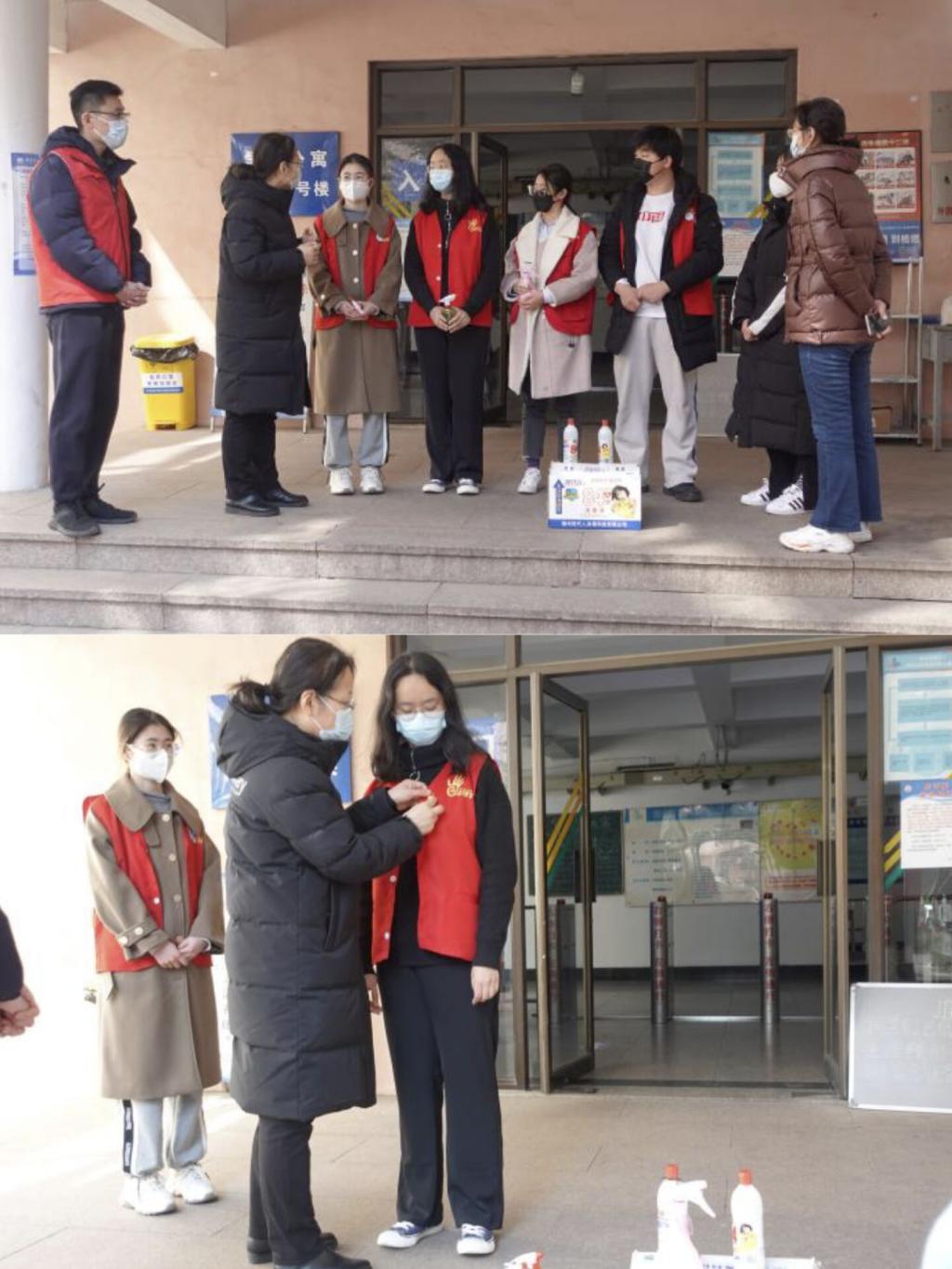 学院党委书记曲斌对当前疫情防控提出要求,强调要从严从紧落实各项防控措施,完善应急预案、做好学生健康状况排查、物资调配、加强教育培训等工作,筑牢校园安全防线,保障学生健康。曲书记亲自为党员佩戴党员徽章。号召党员突击队发挥党员先锋模范作用,让党旗高高飘扬在疫情防控最前沿、最紧处。