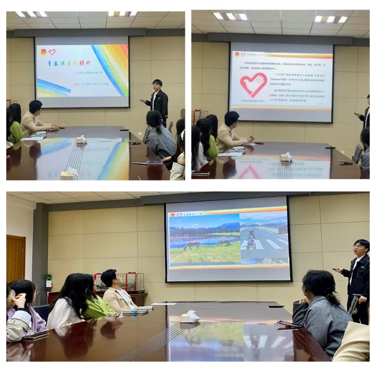 王启真分享了自己在西部任教的经历,解读了相关政策和保障措施。在介绍自己的服务经历时,他通过一张张承载不同故事的照片,多角度展现了他在西部任教期间的点滴。朴实真挚地讲述了他扎根基层、踏实工作、服务人民、超越自我的经历,畅谈了自己在服务地的成长与感受。在他对自己的初心选择、日常工作和西部风土人情的介绍中,所体现的青年的情怀和担当感染了每一位同学,同学们对为西部计划执着坚守、奉献青春的志愿者有了更加深刻的理解和认识。最后他以“当奉献成为习惯,青春才会焕发光彩”进行总结,升华志愿情怀,激发同学们的兴趣和热情,坚定建设祖国西部的决心。