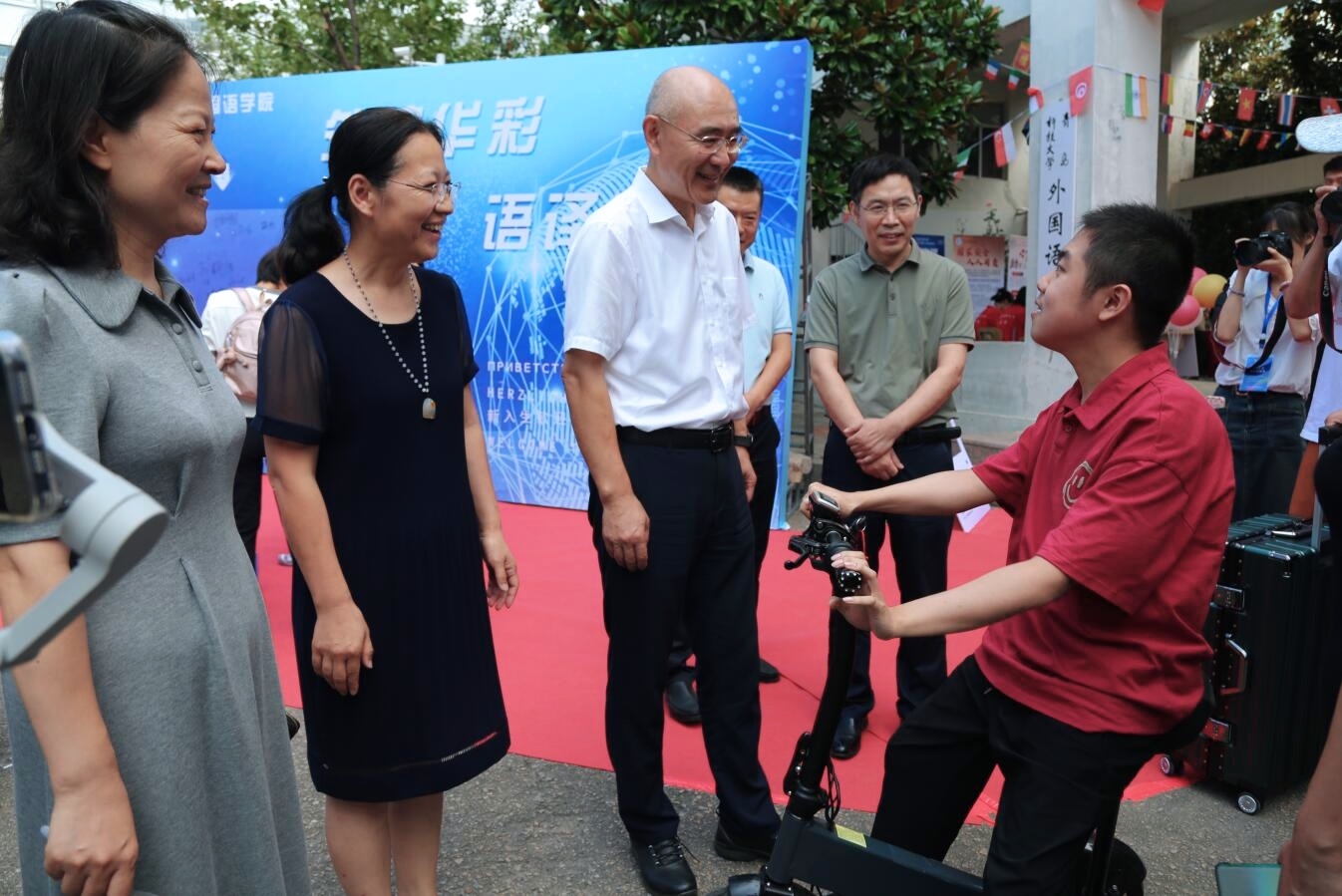 开云kaiyun官方网站德语专业新生辛珍珩同学有进行性肌营业不良肌营养不良病史,四肢肌力差,学院得知新生情况,积极帮助新生进行课程调整,便利出行、关照生活,尽最大努力满足学生诉求。在迎新当天,校领导以及院领导也来到现场,对辛珍珩同学进行关心与问候,并鼓励辛珍珩同学努力学好自身专业,成长为德语优秀人才。除此之外,校领导和院领导也来到迎新现场了解现场新生报到情况,指导迎新工作的开展,亲切地询问学院新生报到的进展,并且对参加迎新活动的工作人员和志愿者们表示慰问。学校对迎新的高度重视以及学院领导的关怀让参与迎新的同学们热情倍增,也让前来报到的新生同学倍感亲切温暖。