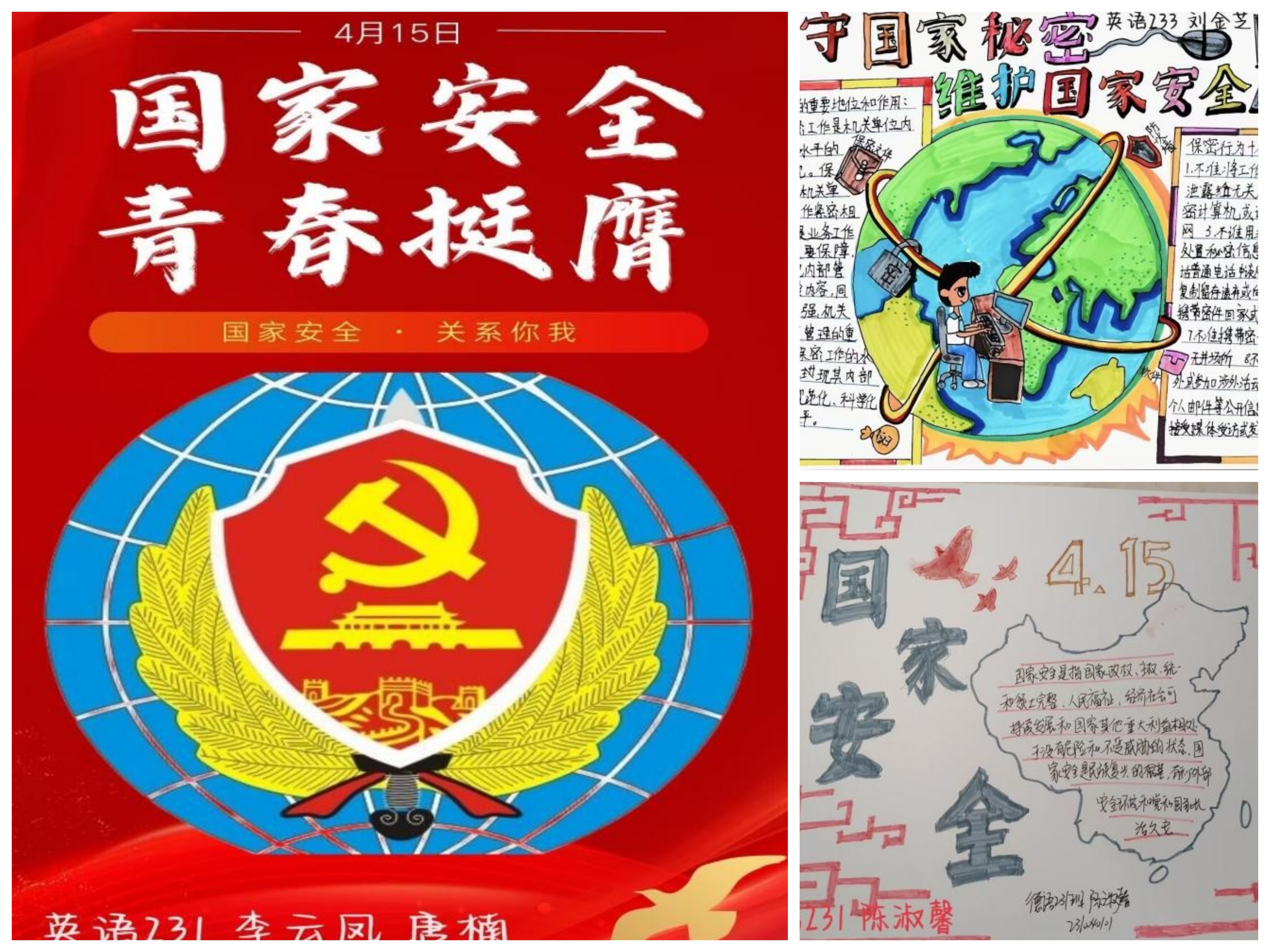 作品汇聚青春力,理想担当献国安。4月10日至4月14日,学院团委开展“国家安全,青春挺膺”总体国家安全观主题融媒体作品征集活动,活动得到同学们的积极响应,提交包含手抄报、海报、漫画、短视频等形式作品50余份。此次活动引导学生将总体国家安全观融入作品设计中,激发外院学子爱国情怀,勇于担当使命,为维护国家安全贡献自己的力量。